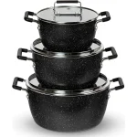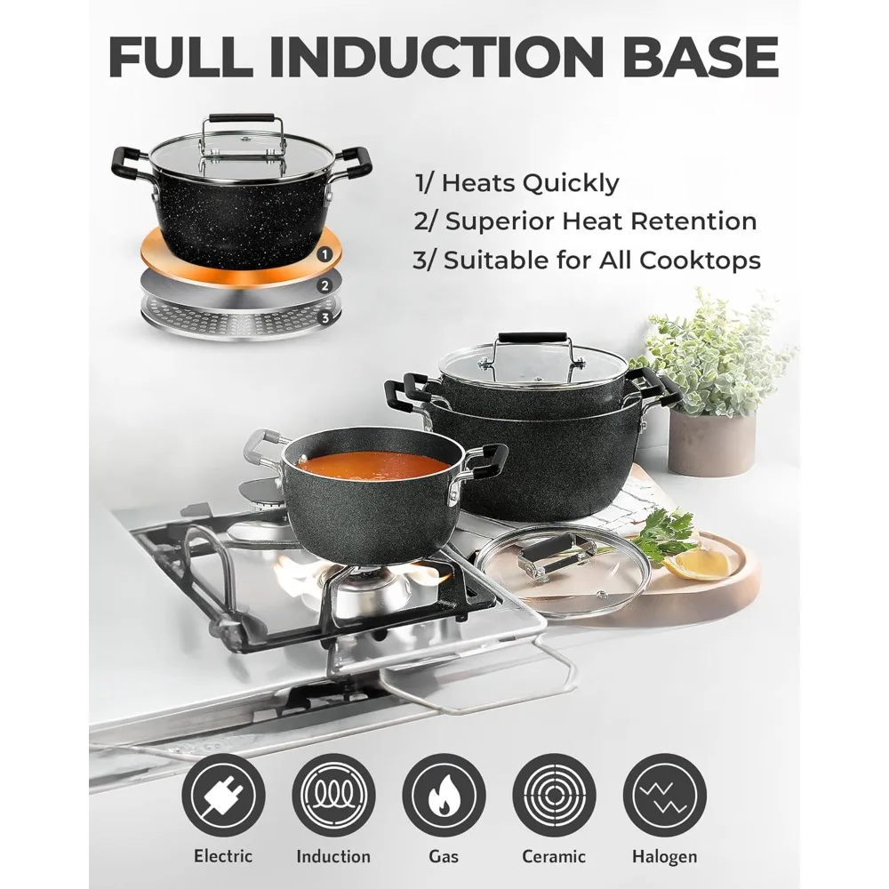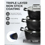 - Complete Cookware set: The Granitestone nesting pots set includes everything you need to start cooking like a pro right of the box while saving tons of space in your cabinets and pantries. The set includes a 1.5 Quart stockpot with a tempered glass lid, a 3.5 Quart stockpot with a tempered glass lid, and a 5 Quart stockpot with a tempered glass lid.
